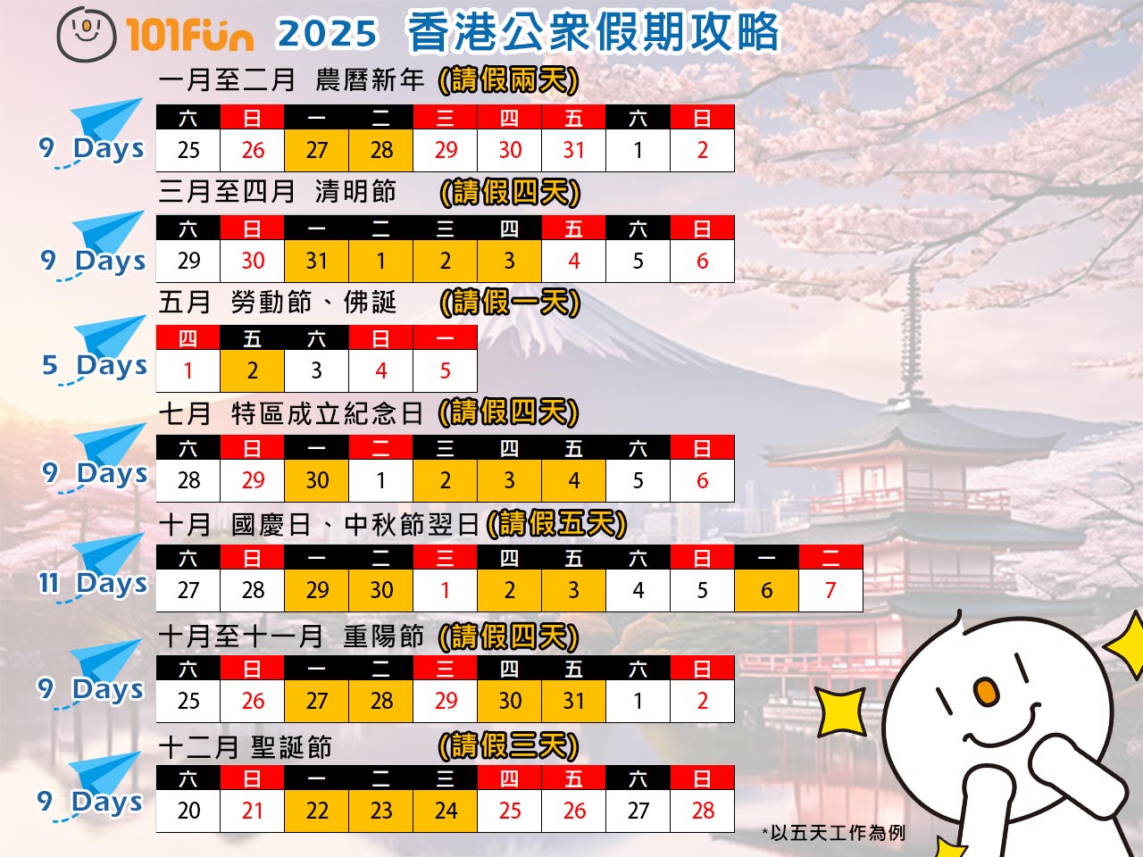 政府已經公布了2025年公眾假期,各位打工仔可以提早規劃行程。開心享受完美的11日長假期!!